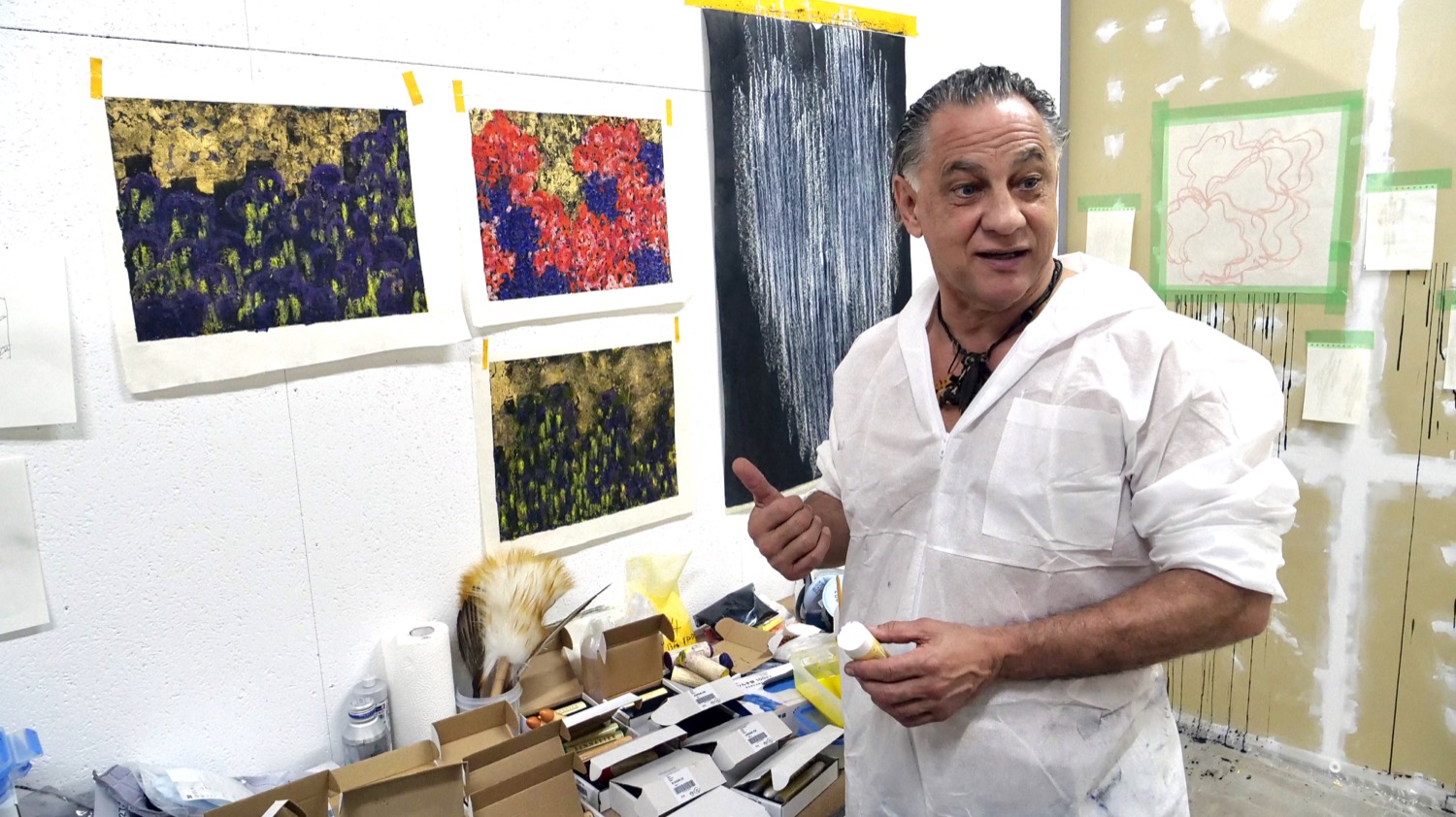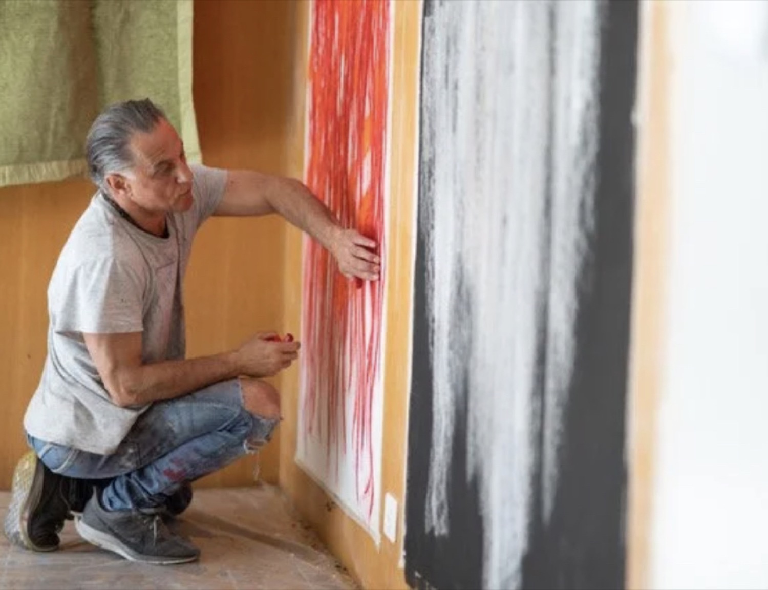 スイス出身のフェルゴ氏は絵画をはじめ、詩、映画、ドローイング、写真など、多彩な⼿法で創作活動を⾏っている。近年は和紙が持つ独特な質感に惹かれ、油彩パステルと顔料を使った作品を制作している。本展のために10月下旬から京都に滞在し、京都市立芸術大学キャンパス内で寺田倉庫が運営するレンタルアトリエ「TERRADA ART STUDIO 京都」で作品制作を進めてきた。
