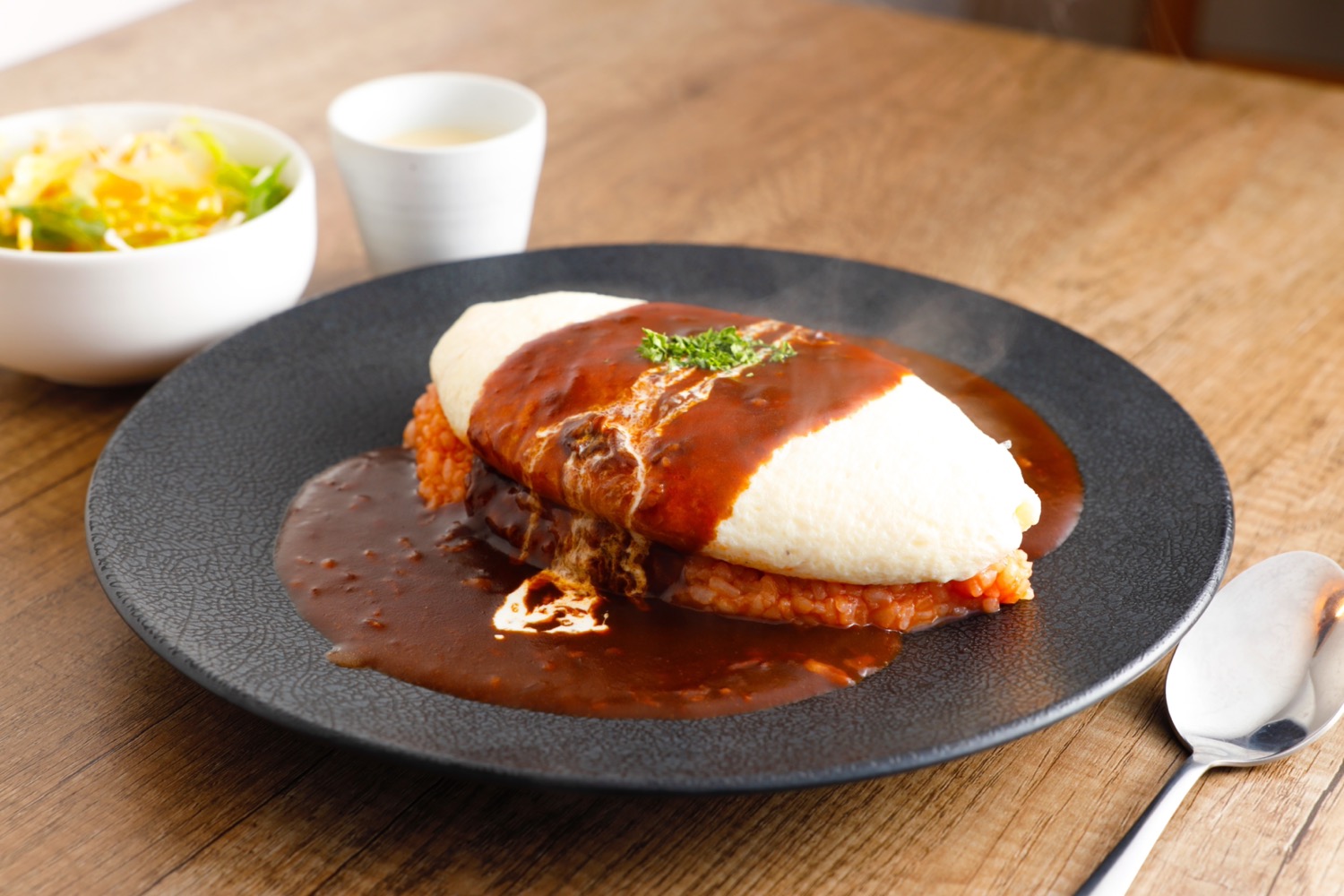 ケチャップライスの上にふっくらと載るオムレツは、卵黄が白い、特別な品種の卵を使用。さらに、ふんだんにかけられたデミグラスソースの香りが食欲をそそります。中を開くと、ふわふわの半熟オムレツの中に、黄色の卵黄が顔を出します。オムレツとは別の種類の卵が使用されているそうです。