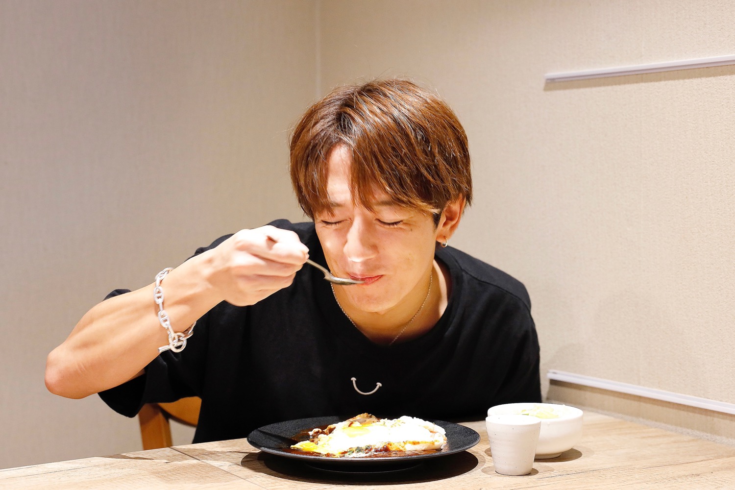 オムライスをパクりと一口頬張る大倉さん。素朴な卵の味わいと、コクのあるデミグラスソースの風味が口いっぱいに広がり、思わずこの表情です。