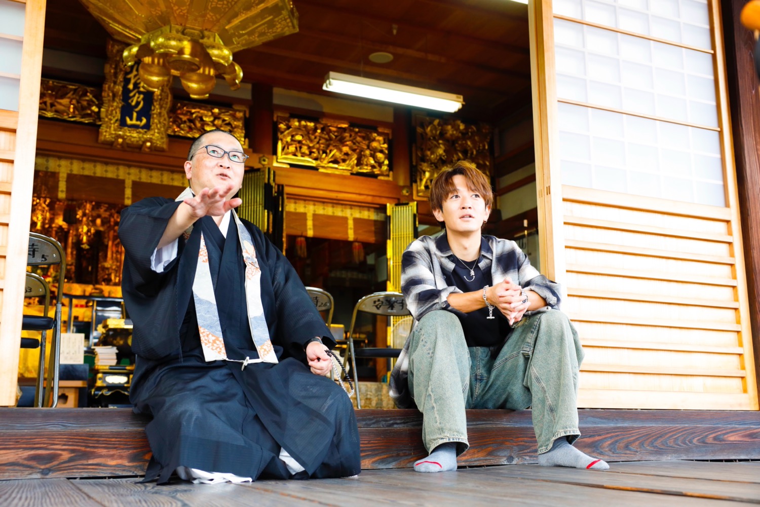 ご住職からお寺の歴史についてお話を聞く大倉さん。