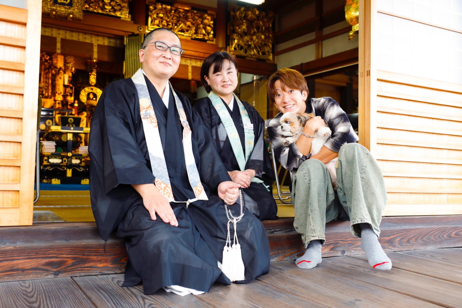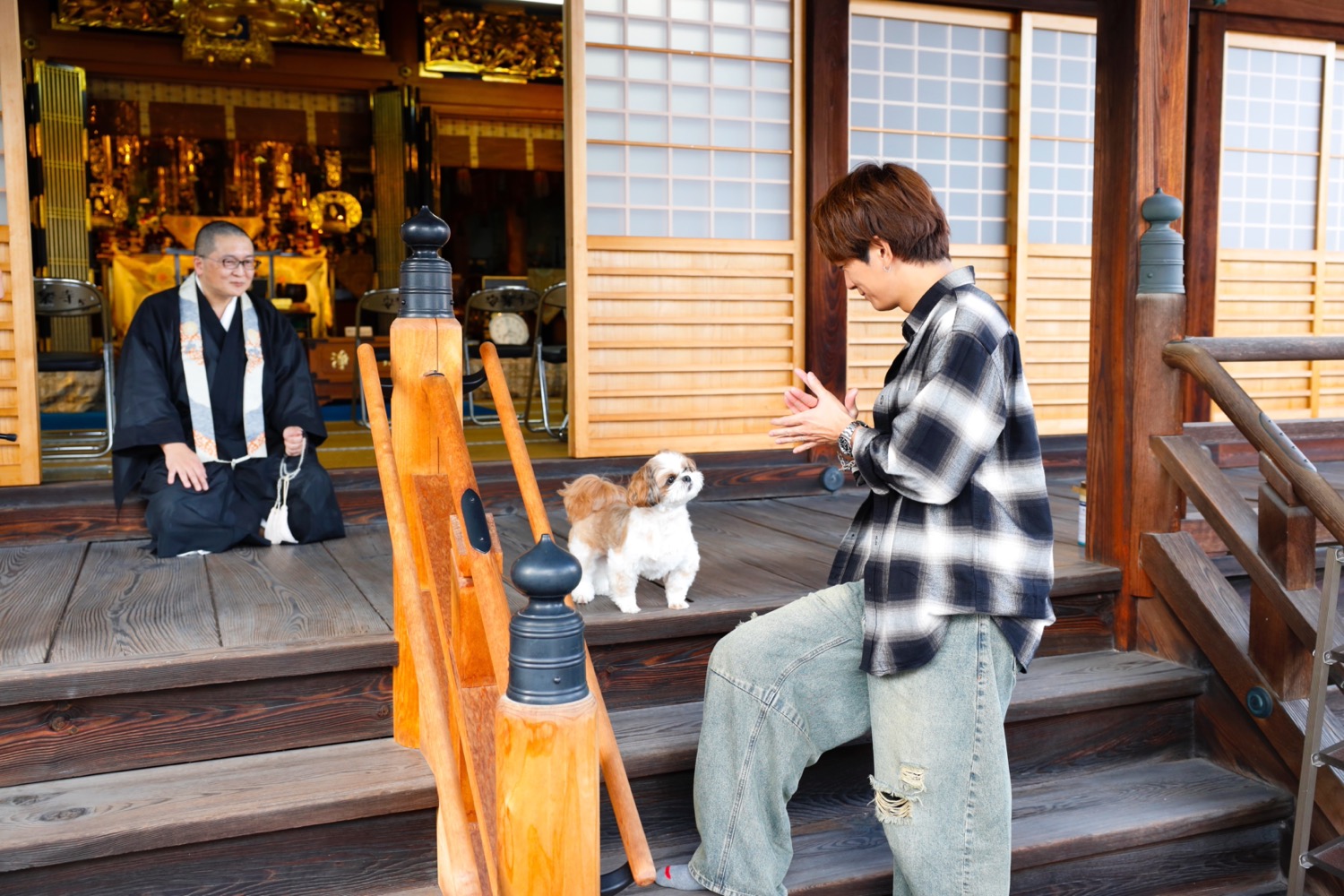 ゆったりお話していると、安楽寺の看板犬、シーズーのスズちゃんが登場。しっぽをふりふり、人懐っこいスズちゃんは、大倉さんを見つけるやいなや飛びつきました。トイプードルを飼っているという大倉さんは流石の手なづけ方で、すぐにスズちゃんも懐きます。