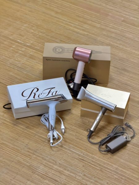 そんな舞妓さん達の綺麗な日本髪ですが、一度髪結いさんとこで結って貰わはったら一週間くらいあの髪型をキープしなくてはならず、髪を解いて洗うことも叶いません。日本髪のままお風呂に来はる時もありますが、髪を固めている鬢付け油が熱に弱くゆっくり浸かっていると髪型が崩れてしまうため、ちゃっと入ってちゃっと上がらはります。正に烏の行水。その習慣が身に染み付き過ぎて、初めのうちは髪を解いた日でさえ20分くらいでお風呂上がったはったのが、この頃はすっかりゆっくり入ってくれはるようになり、「ああ、多少は彼女らにも居心地の良いお風呂を提供できているのかなあ」としみじみ嬉しく思っております。しかし髪を解かはった日は解かはった日で、長い髪を乾かすのに難儀したはるのもドライヤーの音で知っております。そんな舞妓さん達の烏の濡れ羽色の美しい黒髪を労らねばと思いまして。毎年クリスマスは不本意ながらもカップルを乗せた人力車を引いて京都の街をかけるトナカイ役に徹して来た万年独り身の僕ですが、今年はサンタを引き受けてやろうじゃあないですか。ということで、テッテレ~!めっちゃええドライヤ~!!舞妓さん達とあと僕の数少ない女性フォロワーにアンケートを取った中で人気だった3種類の高級ドライヤーを女湯に導入させて頂きました~!!女湯の常連さんの皆さん、脱衣所の床に毎回コロコロかけてくれはっていつもおおきに~。そんな皆さんに大黒サンタからのプレゼントどす。あんじょう使っとおくれやす~。