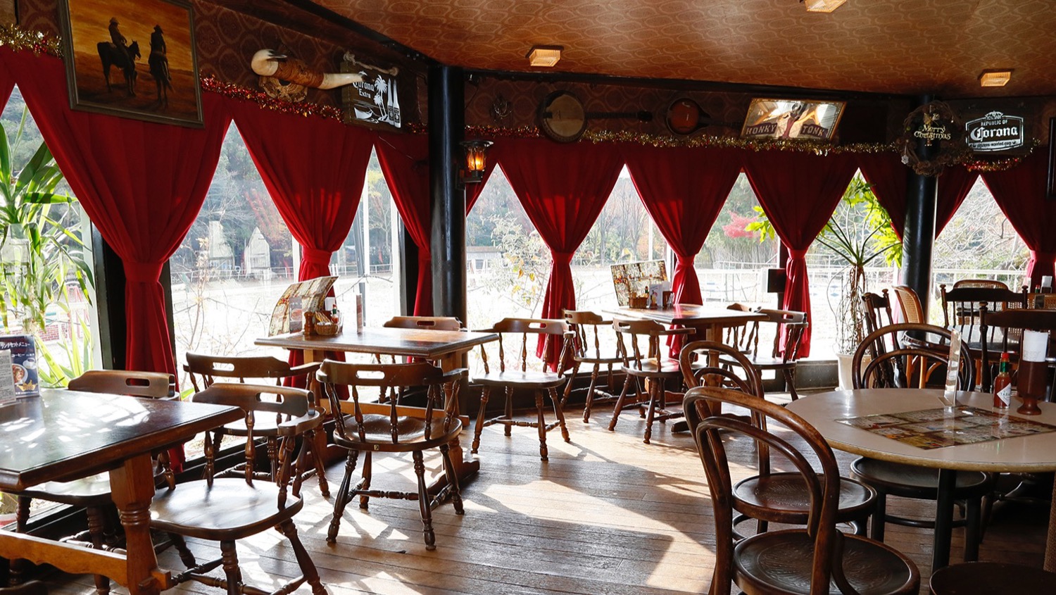 緑豊かな宝ヶ池からほど近い、京都乗馬クラブの一角。馬場を見下ろしながら、白い階段を登って扉を開くと、異世界にトリップしたかのようだ。カウンターの止まり木で、カウボーイたちが酒を飲んでいそうな雰囲気すらあるレストランバー。ここがホンキートンクだ。
