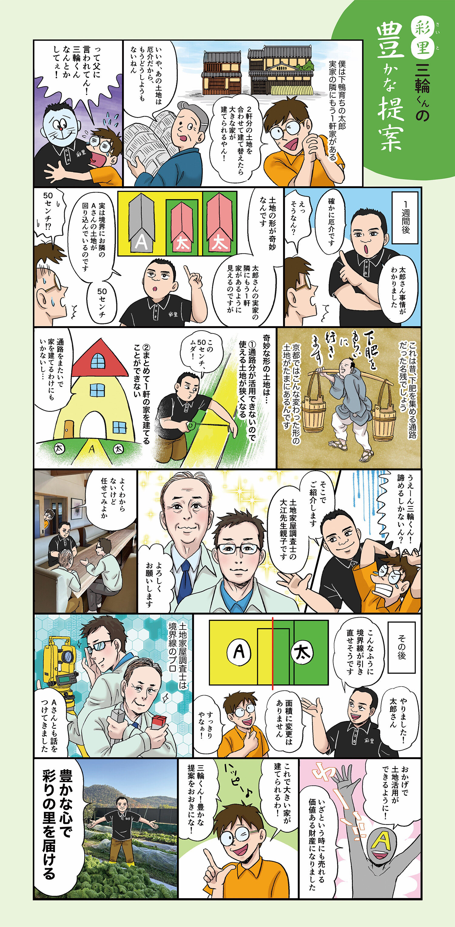今回、のびのびとした太郎くんは「2軒分の土地を1つにしたい」と彩里に相談をしてくれました。しかし、土地の形が奇妙だった……。こんなときに彩里がつなぐのは、土地家屋調査士です。