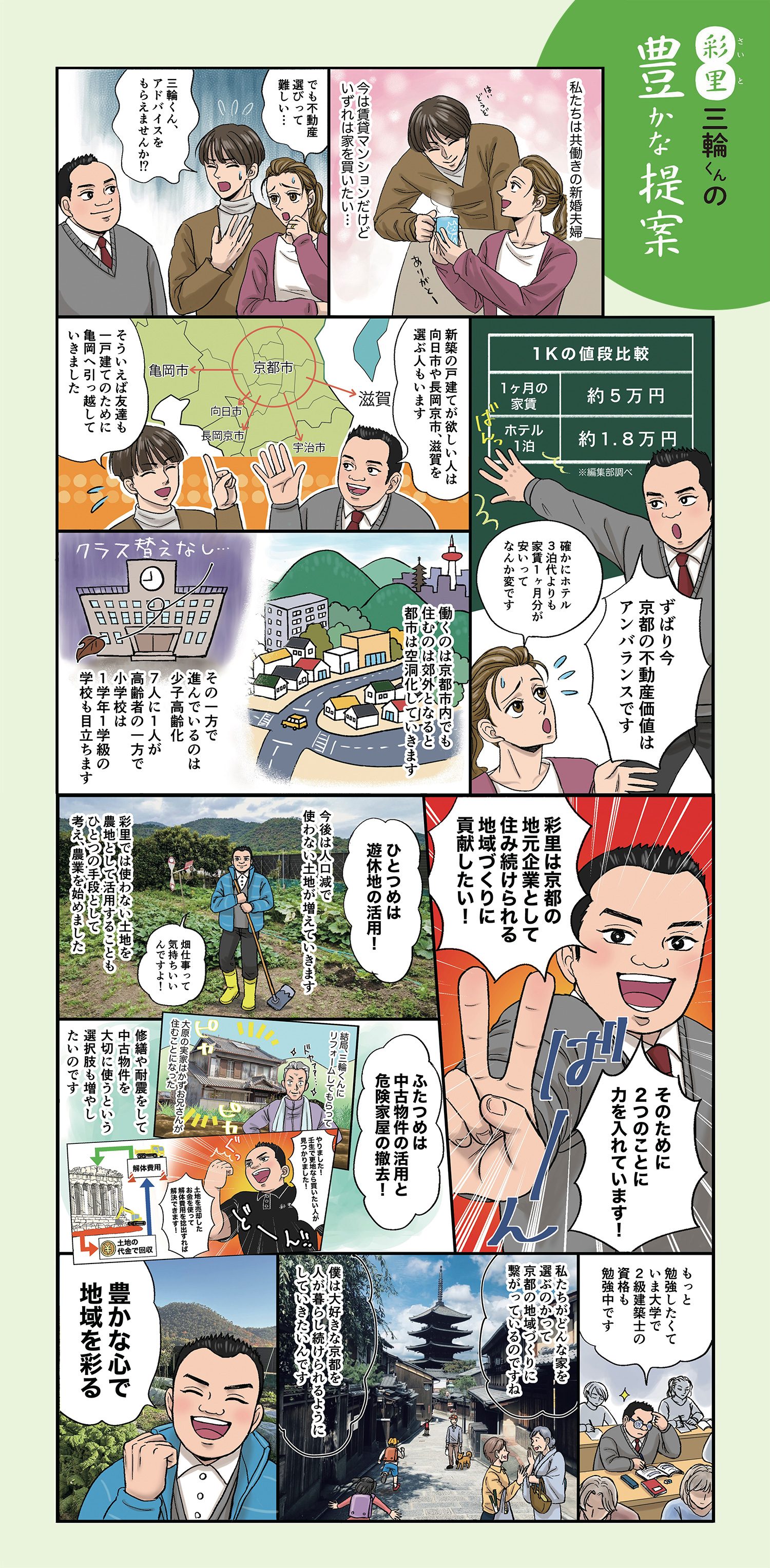 そんな30年後に向けて、彩里の一つの提案は、宅地として使わない土地の、農地としての活用です。農作物が収穫できれば、地産地消で地域内の経済を循環させられる。農作物を新たな京都の魅力にできる。農体験で心を豊かにするー。農業には、豊かな可能性が広がっています。