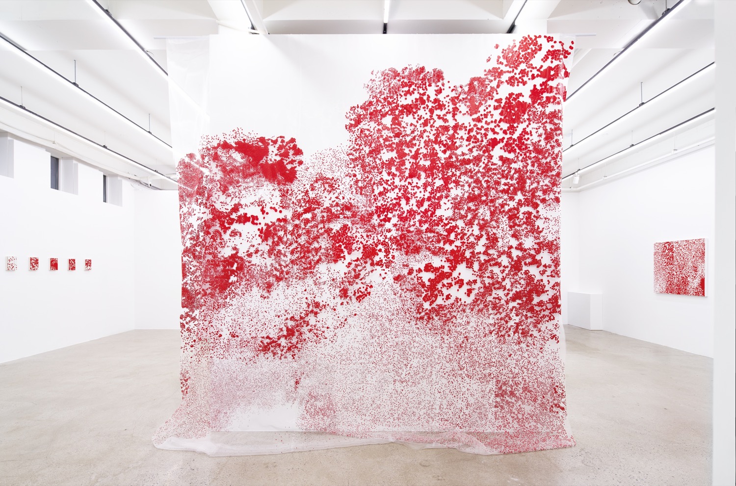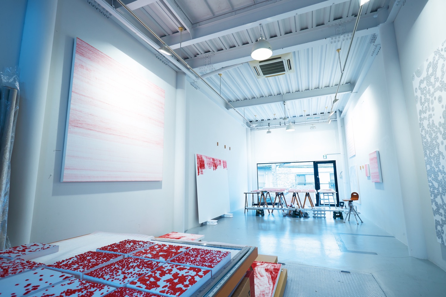 2025年の2月に開催された、初の韓国での個用の様子。真ん中に見えるのは、血液をモチーフにし、複雑な世界に生きる私たちが共通して持つ生命の営みを描く試み「under my skin」。ギャラリー空間を無限の宇宙空間に見立て構成した。