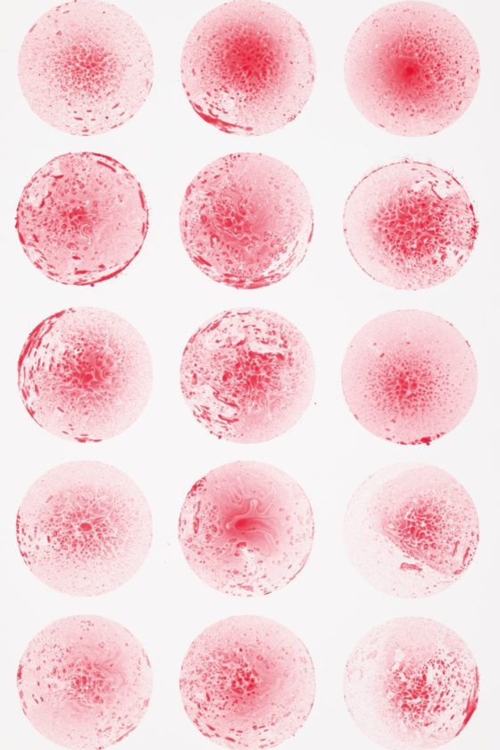 ゼミでは活発なディスカッションが行われ、大和さんも自身の作品について「なぜその言葉を書くのか」を追及された。しかし言葉は自分の内から湧き出たもの。他人に話したくはない。悩んだ大和さんは試行錯誤を経て、ついに「言葉の代わりにドット」を用いた作品を生み出す。それが初期の代表作「RED DOT」だ。