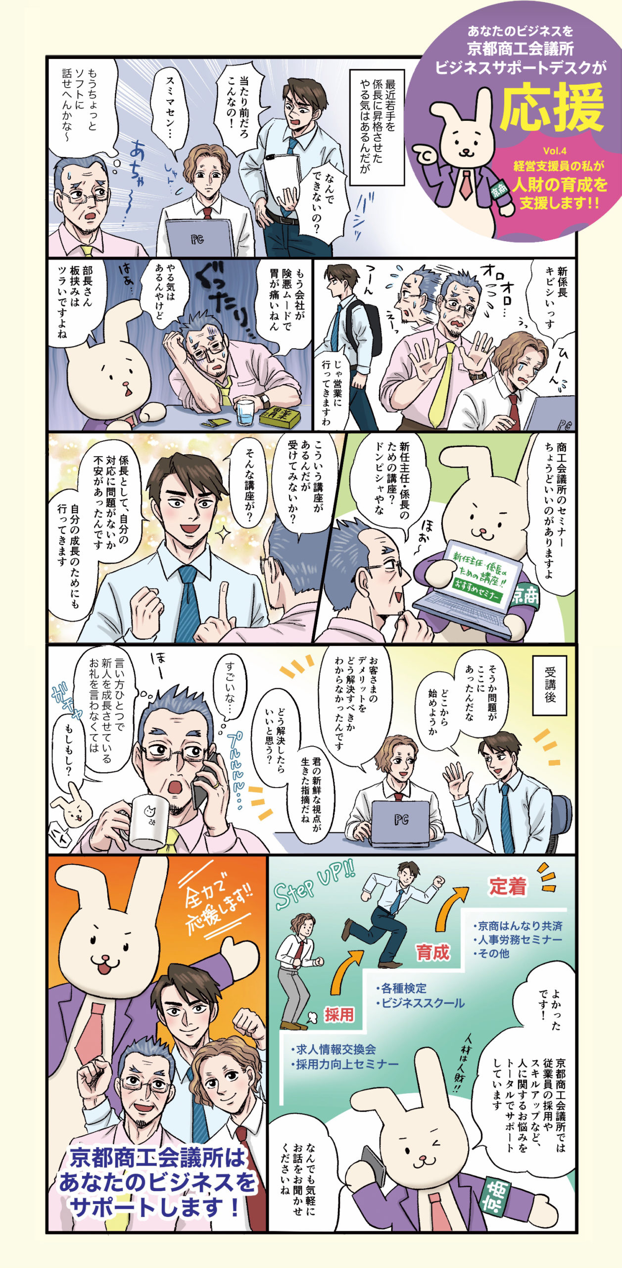 京都商工会議所では、採用、育成、定着に関するお悩みについて、経営支援員や経験豊富な専門家を交えて、伴走支援します。お気軽にご相談ください。